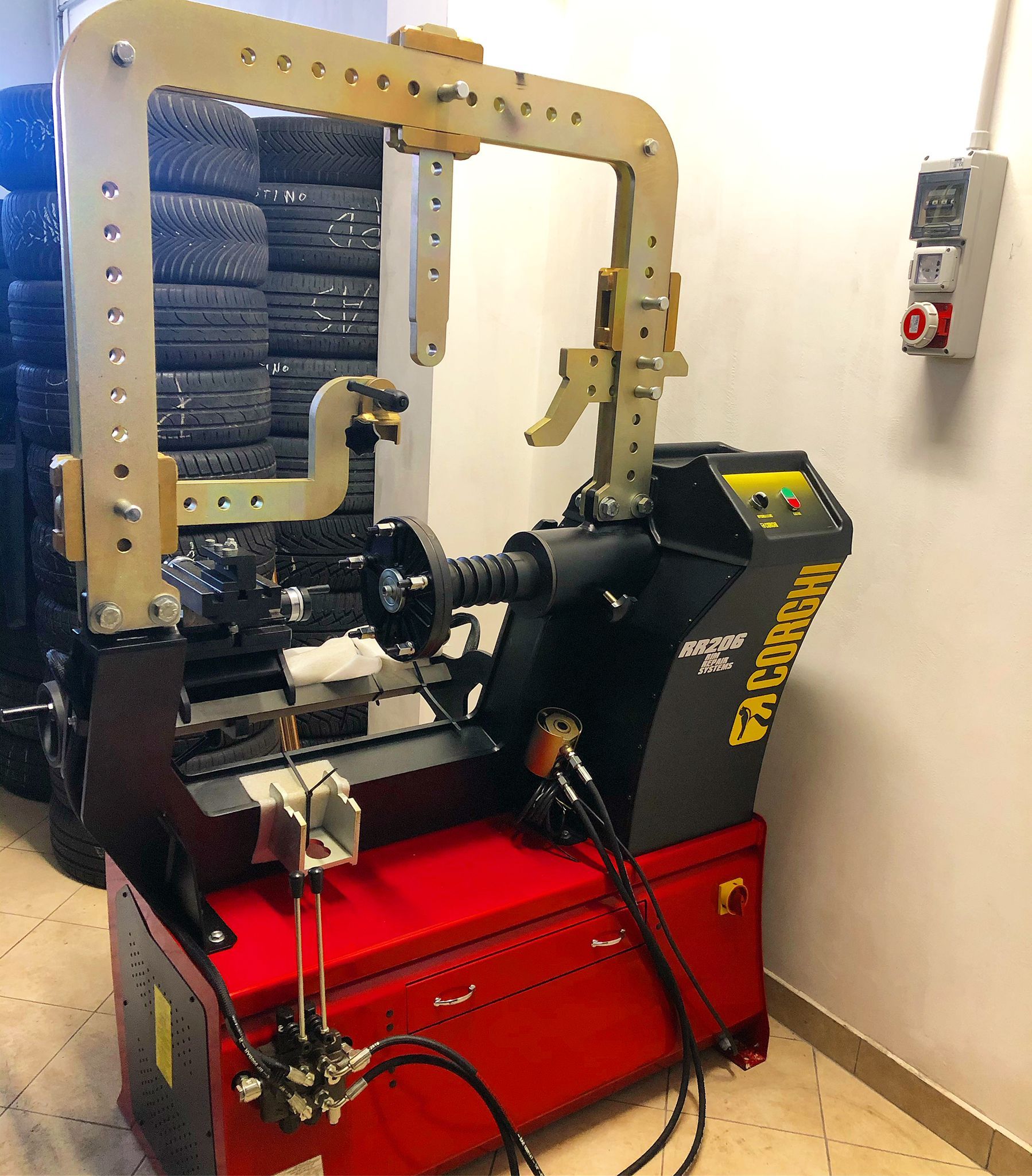 Dispone infatti di uno smontagomme per autocarri Corghi adatto alle diverse dimensioni di camion e macchine agricole o industriali.